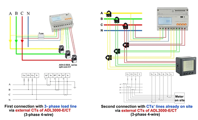 Actuel | Courant d'entrée | 3 × 1(6)A (deuxième connexion avec le câble des CTs déjà sur le site via des CTs externes de ADL3000-E/CT) 3 × 10(100)A (première connexion avec une ligne de charge triphasée via des CT externes de ADL3000-E/CT) |
