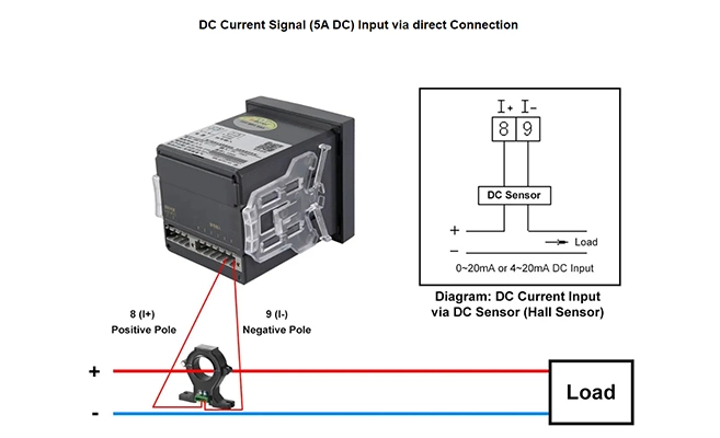 | Entrée | Courant évalué | Entrée de courant continu: 5A DC (connexion directe); 0 ~ 20mA ou 4 ~ 20mA DC (via DC Sensor); 75mV DC (via Shunt) |
