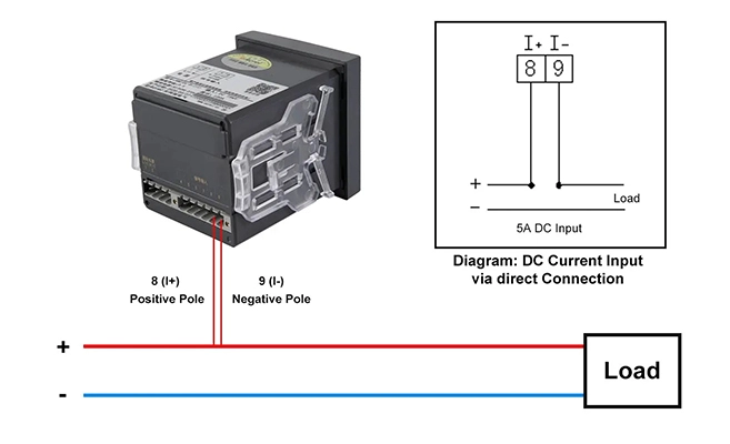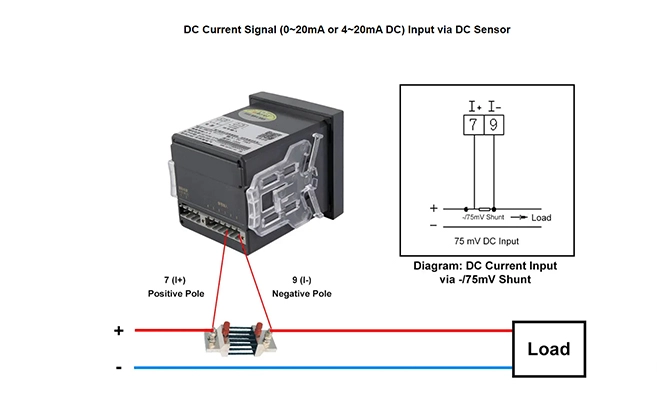 Courant nominal: 5A DC (connexion directe); 0/4 ~ 20mA DC (via capteur DC); 75mV (via Shunt)