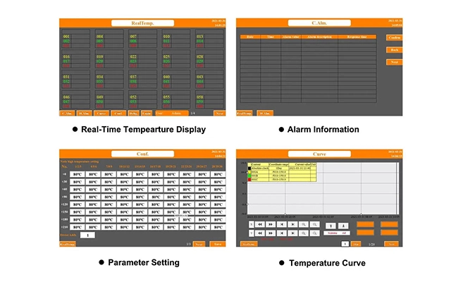 Contrôle d'écran tactile ● Affichage des données de surveillance de la température ● Réglage des paramètres ● Réglage de la liaison des capteurs de température ● Affichage d'alarme |